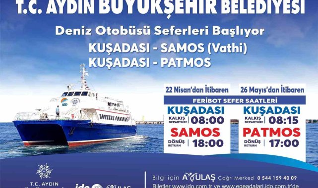 Aydın'ın Kuşadası ilçesi ile Yunanistan'ın Samos ve Patmos adalarına ulaşımı sağlayan deniz otobüsü seferleri için geri sayım başlarken, 22 Nisan itibariyle seferlerin başlayacağını duyuran Aydın Büyükşehir Belediye Başkanı Özlem Çerçioğlu; "Ege'nin iki yakasını hızlı, güvenli ve konforlu bir şekilde birbirine bağlıyoruz" dedi.Aydın Büyükşehir Belediye Başkanı Özlem Çerçioğlu, Kuşadası'ndan Yunan adaları Samos ve Patmos'a deniz otobüsü seferlerinin başlayacağını duyurdu. Aydın Büyükşehir Belediyesi tarafından turizmi canlandırmak ve ulaşımı kolaylaştırmak amacıyla hayata geçirilen proje kapsamında, Kuşadası ile Samos ve Patmos adaları arasında düzenli seferler gerçekleştirilecek. Kuşadası-Samos hattında seferler 22 Nisan itibarıyla başlayacak. Sabah saat 08.00'de Kuşadası'ndan hareket edecek deniz otobüsünün dönüşünü ise saat 18.00'de gerçekleştirecek.Kuşadası-Patmos hattında ise seferler 26 Mayıs'tan itibaren başlayacak. Bu hatta Kuşadası'ndan kalkış saati 08.15, Patmos'tan dönüş saati ise 17.00 olarak planlandı.Aydın Büyükşehir Belediye Başkanı Özlem Çerçioğlu, yeni seferlerle ilgili yaptığı açıklamada, "Kuşadası'ndan Samos ve Patmos adalarına deniz otobüsü seferlerimiz başlıyor, Ege'nin iki yakasını hızlı, güvenli ve konforlu bir şekilde birbirine bağlıyoruz. Turizmimize değer katmaya, Aydınımızı her alanda marka kent yapmaya devam edeceğiz" ifadelerini kullandı.