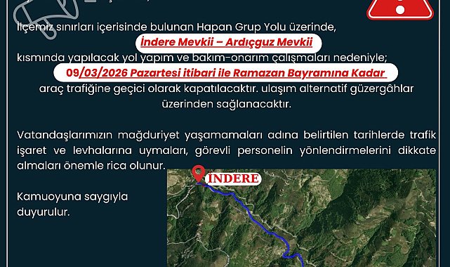 Samsun'un Ayvacık ilçesinde devam eden yol bakım ve onarım çalışmaları nedeniyle Hapan grup yolu Ramazan Bayramı'na kadar trafiğe kapatıldı.Ayvacık Kaymakamlığı'ndan yapılan açıklamada, Hapan grup yolu üzerindeki İndere mevkii ile Ardıçgüz mevkii arasında yürütülecek çalışmalar kapsamında yolun 9 Mart itibarıyla araç trafiğine geçici olarak kapatıldığı bildirildi. Ulaşımın bu süreçte alternatif güzergâhlar üzerinden sağlanacağı belirtildi.Açıklamada ayrıca sürücülerin mağduriyet yaşamamaları için trafik işaret ve levhalarına uymaları ve görevli personelin yönlendirmelerini dikkate almaları istendi. Çalışmaların Ramazan Bayramı'na kadar devam edeceği ifade edildi.