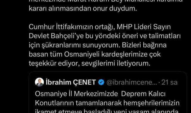 Osmaniye'de kent merkezinde oluşturulacak bir mahalleye Çevre, Şehircilik ve İklim Değişikliği Bakanı Murat Kurum'un adının verilmesinin planlandığını bildirdi.Osmaniye Belediyesi tarafından 6 Şubat 2023'te Kahramanmaraş merkezli depremlerden ağır şekilde etkilenen Osmaniye, yeniden ayağa kalkıyor. Şehrin toparlanma sürecinde kalıcı konutların yükseldiği yeni yaşam alanında, "Murat Kurum Bey Mahallesi" adıyla yeni bir mahalle kurulması planlanıyor. Depremin yaralarını hızla saran Osmaniye'de, kalıcı konut bölgelerinin mahalle statüsüne kavuşmasıyla birlikte şehirde yeni bir dönem başlayacak. Belediye yetkilileri, kararın mecliste onaylanmasının ardından mahalle kurulumu ve muhtarlık seçim sürecinin başlatılacağını bildirdi.Osmaniye Belediyesi'nden yapılan açıklamada, mahalleye Çevre, Şehircilik ve İklim Değişikliği Bakanı Murat Kurum'un isminin verilmesinin, MHP Genel Başkanı ve Osmaniyeli hemşehrisi Devlet Bahçeli'nin önerisiyle belediye meclisinde görüşüleceği belirtildi.Açıklamada şu ifadelere yer verildi:"İl merkezimizde kalıcı konutların yükseldiği, ortak yaşam alanlarının doğduğu bölgede ikamet eden hemşehrilerimizin taleplerini ilk elden çözebilmek amacıyla, demokrasinin ilk basamağı olan muhtarlık makamının oluşturulması belediyemizin kasım ayı meclisinde karara bağlanacaktır. Genel Başkanımız ve hemşehrimiz Devlet Bahçeli'nin öneri ve talimatlarıyla 'Murat Kurum Bey Mahallesi' gündeme alınmıştır."Çevre, Şehircilik ve İklim Değişikliği Bakanı Murat Kurum ise sosyal medya hesabından konuyla ilgili yaptığı açıklamada, "6 Şubat asrın felaketinde yara alan Osmaniye'mizi ayağa kaldırmak, Osmaniyeli hemşehrilerimizi yuvalarına kavuşturmak için çok çalıştık, çalışıyoruz. Bu çabanın Osmaniye'miz tarafından takdir gördüğünü, önce fahri hemşehrilik şimdi de il merkezinde Murat Kurum Bey Mahallesi kurulma kararı alınmasından onur duydum. Cumhur İttifakımızın ortağı, MHP lideri Sayın Devlet Bahçeli'ye bu yöndeki öneri ve talimatları için şükranlarımı sunuyorum. Bizleri bağrına basan tüm Osmaniyeli kardeşlerimize çok teşekkür ediyor, sevgilerimi iletiyorum."