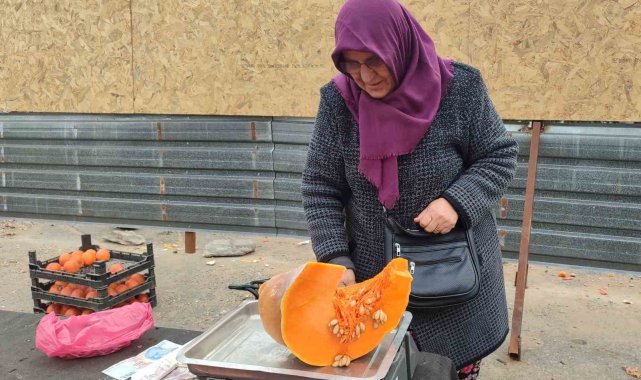 Kahramanmaraş'ta esnaf kadın, kendi bahçesinde ürettiği balkabaklarını satarak geçimini sağlıyor.