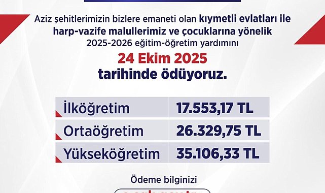 Çalışma ve Sosyal Güvenlik Bakanı Vedat Işıkhan, "Aziz şehitlerimizin bizlere emaneti evlatlarımıza, harp-vazife malullerimize ve çocuklarına eğitim-öğretim yardımını 24 Ekim Cuma günü ödüyoruz" dedi.