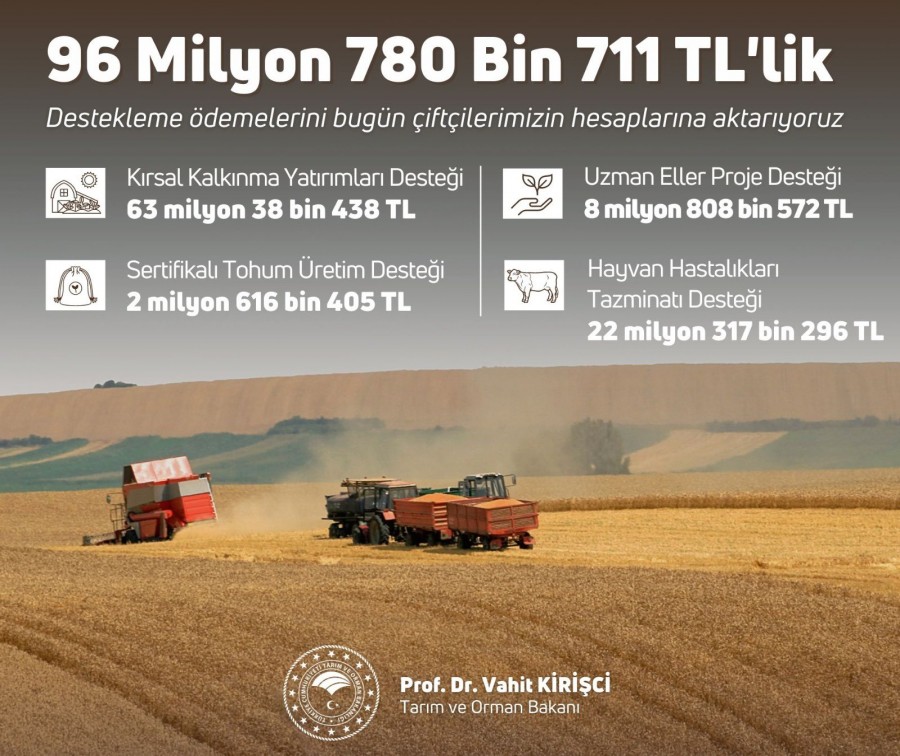 Tarım ve Orman Bakanı Vahit Kirişci, tarımsal destek ödemelerinin bugün hesaplara yatacağını açıkladı.Bakan Kirişci'nin açıklaması şöyle; "96 milyon 780 bin 711 TL'lik tarımsal destek ödemelerini bugün çiftçilerimizin hesaplarına aktarıyoruz. Hayırlı ve bereketli olsun."