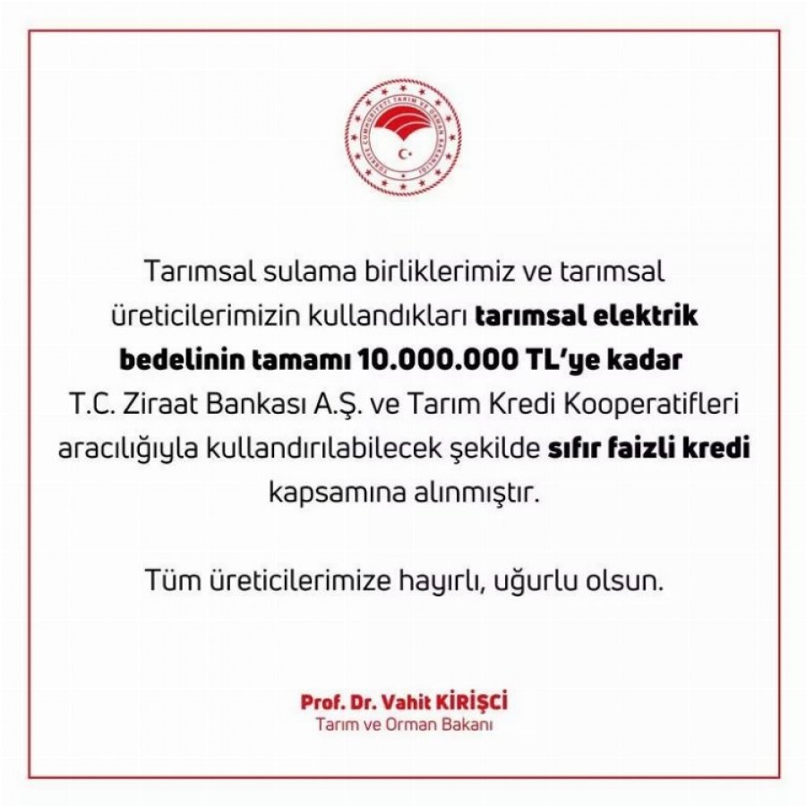 Tarım ve Orman Bakanı Vahit Kirişçi, "Tarımsal sulama birliklerimiz ve tarımsal üreticilerimizin kullandıkları tarımsal elektrik bedelinin tamamı 10 milyon TL'ye kadar T.C Ziraat Bankası ve Tarım Kredi Kooperatifleri aracılığıyla kullandırılabilecek şekilde sıfır faizli kredi kapsamına alındı" dedi.