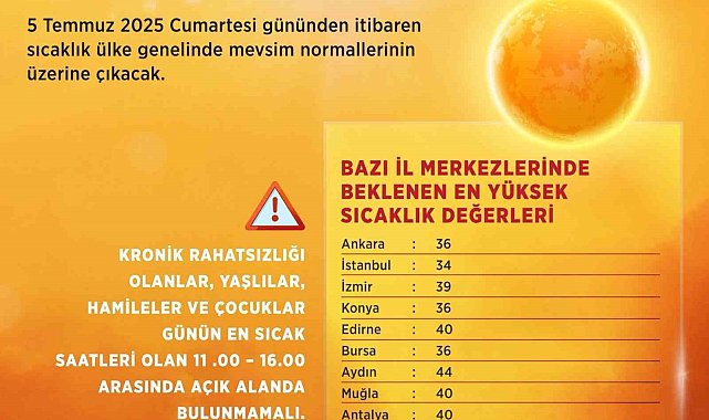 Çevre, Şehircilik ve İklim Değişikliği Bakanı Murat Kurum, hava sıcaklıklarının önümüzdeki hafta artacağı uyarısında bulundu.Bakan Kurum, sosyal medya hesabından yaptığı paylaşımda, "Az önce Meteoroloji Genel Müdürlüğümüzden aldığımız verilere göre önümüzdeki hafta hava sıcaklıkları ciddi derecede artış gösterecek. Bu hem sağlığımız hem de orman yangınlarının önüne geçmek açısından daha tedbirli olmamız gerektiği anlamına geliyor. Süreçte çok daha duyarlı davranmak hayati önemde" ifadelerine yer verdi.Çevre, Şehircilik ve İklim Değişikliği Bakanlığı Meteoroloji Genel Müdürlüğü'nün değerlendirmelerine göre iç ve doğu kesimlerde mevsim normalleri altında seyreden hava sıcaklıkları ülke genelinde artacak. 5-12 Temmuz tarihleri arasında sıcaklıkların 4-6 derece daha artması bekleniyor. Söz konusu tarihlerde en yüksek sıcaklık değerlerinin Ankara'da 36, İstanbul'da 34, İzmir'de 39, Konya'da 36, Edirne'de 40, Bursa'da 36, Aydın'da 44, Muğla'da 40, Antalya'da 40, Adana'da 38 ve Diyarbakır'da 43 derece olması bekleniyor.