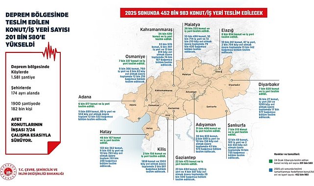 Çevre, Şehircilik ve İklim Değişikliği Bakanı Murat Kurum, "Son ev ve iş yerini teslim edene dek deprem bölgesinden ayrılmayacağız" dedi.Çevre, Şehircilik ve İklim Değişikliği Bakanlığı, asrın felaketinin ardından Yeniden Daha Güçlü Anadolu'yu seferberlik ruhuyla inşa etmeye devam ediyor. Dünyanın en büyük şantiye alanına dönüştürülen 11 ilde 182 bin kişi depremzede vatandaşları sağlam konutlarına kavuşturmak için 7/24 esasıyla çalışıyor. Deprem bölgesinde teslim edilen konutların sayısı ile ilgili son durumu sosyal medya hesabından paylaşan Bakan Kurum, "Son evimizi ve iş yerimizi kardeşlerimize teslim edecek, yüzünü güldürmediğimiz tek bir vatandaşımız kalmayana dek deprem bölgesinden ayrılmayacağız" ifadelerini kullandı.46 bin 307 konut ve 149 iş yeri daha teslim edildiHatay'da 13 bin 980, Malatya'da 6 bin 554, Gaziantep'te bin 535, Kahramanmaraş'ta 7 bin 202, Adıyaman'da 6 bin 781, Osmaniye'de bin 921, Adana'da 2 bin 945, Diyarbakır'da 822, Elazığ'da 3 bin 353, Kilis'te 223, Şanlıurfa'da 991 olmak üzere toplam 46 bin 307 konut ve 149 iş yerinin daha hak sahipleri belirlendi. Böylece bugüne kadar teslim edilen konut ve iş yeri sayısı 201 bin 580'e yükseldi. 2025 yılı sonunda ise 358 bin 859 konut, 31 bin 307 iş yeri ve 62 bin 817 köy evi olmak üzere toplam 452 bin 983 bağımsız bölüm hak sahiplerine teslim edilmiş olacak.Bakan Kurum, "Deprem bölgemizi ihya etmeden bize durmak yok. 11 şehirde; 174 ayrı alanda 1.900 şantiyede, 182 bin mimar, mühendis ve işçimizle bugüne kadar 201 bin 580 konut ile iş yerimizin anahtarlarını teslim ettik. Son evimizi ve iş yerimizi kardeşlerimize teslim edecek, yüzünü güldürmediğimiz tek bir vatandaşımız kalmayana dek deprem bölgesinden ayrılmayacağız" dedi.Yerinde dönüşüm ile 21 milyar TL destek11 ilde 174 ayrı alanda, toplam 3 bin 481 şantiyede, 182 bin kişi afet konutlarını bir an önce teslim etmek için 7/24 esasıyla seferberlik ruhuyla çalışıyor. Bununla birlikte, deprem bölgesindeki depremzedelere kendi evlerini ve iş yerlerini kendileri yaptırmak isterse Yerinde Dönüşüm Projesi kapsamında 2 yıl geri ödemesiz, 10 yıl vadeli ve faizsiz olarak kredi ve hibe veriliyor. Konutlara 750 bin lira hibe, 750 bin lira kredi ve vatandaşların proje hazırlığı yaparken kullanabilmeleri için 40 bin lira proje desteği sağlanıyor. İş yerlerine ise 400 bin lira hibe, 400 bin lira kredi ve yine 40 bin lira proje desteği veriliyor. Ahırlı konutlar için 750 bin lira hibe, 1 milyon lira kredi ve 40 bin lira proje desteği sağlanıyor. İlk konut ve iş yeri için "Yerinde Dönüşüm" desteklerinden faydalanan vatandaşlar iki ve üçüncü konut/iş yeri için de 40 bin lira proje desteği ve kredi imkanından faydalanabiliyor. Destekten asrın felaketinin ardından "Genel Hayata Etkili Afet Bölgesi" ilan edilen 18 il faydalanabiliyor. "Yerinde Dönüşüm" projesi kapsamında ruhsatlandırılan bağımsız bölümlere yönelik bugüne kadar 21 milyar lira hibe ve kredi desteği sağlandı. Bugüne kadar deprem bölgesindeki altyapı hizmetleri için ise İller Bankası 65 milyar TL tutarında hibe desteği aktardı.Teslim edilen konut, köy evi ve iş yeri sayıları şöyle:"Deprem bölgesindeki 11 ilde bugüne kadar 169 bin 171 konut, 149 iş yeri ve 32 bin 260 köy evi olmak üzere toplam 201 bin 580 bağımsız bölüm teslim edildi. İllere göre dağılım ise şöyle: Adana'da 6 bin 700 konut ve 117 köy evi olmak üzere toplam 6 bin 817 bağımsız bölüm, Adıyaman'da 27 bin 433 konut ve 3 bin 973 köy evi olmak üzere toplam 31 bin 406 bağımsız bölüm, Diyarbakır'da 7 bin 665 konut, 255 köy evi olmak üzere toplam 7 bin 920 bağımsız bölüm, Elazığ'da 8 bin 149 konut, 685 köy evi olmak üzere toplam 8 bin 834 bağımsız bölüm, Gaziantep'te 19 bin 428 konut, 52 iş yeri ve 2 bin 995 köy evi olmak üzere toplam 22 bin 475 bağımsız bölüm, Hatay'da 40 bin 586 konut, 27 iş yeri ve 5 bin 554 köy evi olmak üzere toplam 46 bin 167 bağımsız bölüm, Kahramanmaraş'ta 24 bin 420 konut, 30 iş yeri ve 10 bin 180 köy evi olmak üzere toplam 34 bin 630 bağımsız bölüm, Kilis'te bin 713 konut, 4 iş yeri ve 439 köy evi olmak üzere toplam 2 bin 156 bağımsız bölüm, Malatya'da 20 bin 212 konut, 20 iş yeri ve 6 bin 93 köy evi olmak üzere toplam 26 bin 325 bağımsız bölüm, Osmaniye'de 6 bin 391 konut, 6 iş yeri ve 940 köy evi olmak üzere toplam 7 bin 337 bağımsız bölüm, Şanlıurfa'da 6 bin 474 konut, 10 iş yeri ve bin 29 köy evi olmak üzere toplam 7 bin 513 bağımsız bölüm teslim edildi"Deprem bölgesindeki 11 ilde 2025 yılı sonunda 358 bin 859 konut, 31 bin 307 iş yeri ve 62 bin 817 köy evi olmak üzere toplam 452 bin 983 bağımsız bölüm hak sahiplerine teslim edilmiş olacak.İllere göre dağılım ise şöyle:"Adana; 12 bin 522 bağımsız bölüm '11 bin 899'u konut, 89'u iş yeri ve 534'ü köy evi' Adıyaman; 43 bin 573 bağımsız bölüm '30 bin 835'i konut, 2 bin 580'i iş yeri ve 10 bin 158'i köy', Diyarbakır; '17 bin 577 bağımsız bölüm (16 bin 27'si konut, 251'i iş yeri ve bin 299'u köy evi', Elazığ; 13 bin 142 bağımsız bölüm '10 bin 261'i konut, 87'si iş yeri, 2 bin 794'ü köy evi', Gaziantep; 29 bin 500 bağımsız bölüm '23 bin 694'ü konut, bin 219'u iş yeri ve 4 bin 587'si köy evi', Hatay; 153 bin 248 bağımsız bölüm (133 bin 382'si konut, 9 bin 103'ü iş yeri ve 10 bin 763'ü köy evi', Kahramanmaraş; 74 bin 187 bağımsız bölüm '53 bin 976'sı konut, 6 bin 397'si iş yeri ve 13 bin 814'ü köy evi', Kilis; 2 bin 861 bağımsız bölüm (1854'ü konut, 4'ü iş yeri ve 1003'ü köy evi', Malatya; 79 bin 420 bağımsız bölüm '55 bin 496'sı konut, 10 bin 714'ü iş yeri ve 13 bin 210'u köy evi', Osmaniye; 12 bin 218 bağımsız bölüm '9 bin 366'sı konut, 760'ı iş yeri ve 2 bin 92'si köy