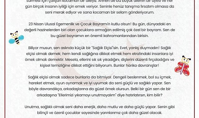 Sağlık Bakanı Kemal Memişoğlu, 2 bin 36 sağlık elçisinin 23 Nisan Ulusal Egemenlik ve Çocuk Bayramı'nı gönderdiği mektupla kutladı.