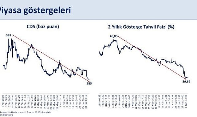 Hazine ve Maliye Bakanı Mehmet Şimşek, "Nisan ayında 381 baz puana kadar yükselen risk primi (CDS), 283 baz puana geriledi. İki yıllık gösterge tahvil faizi ise yüzde 49'dan yüzde 40'ın altına indi" dedi.