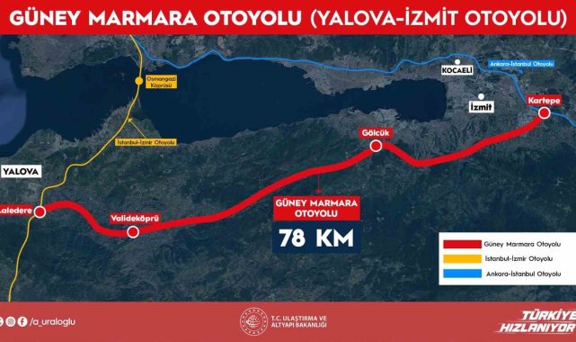Ulaştırma ve Altyapı Bakanı Abdulkadir Uraloğlu, Yalova ile İzmit arasında inşa edilecek 78 kilometrelik Güney Marmara Otoyolu Projesi'ne ilişkin yaptığı açıklamada, projenin Kocaeli, Sakarya ve Bursa gibi üretim merkezlerinin birbirine daha verimli entegrasyonunu sağlayacağını söyledi.