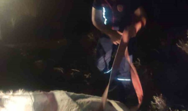 Hatay'da dere yatağında balçığa saplanan eşek, vinç yardımıyla kurtarılarak sahibine teslim edildi.