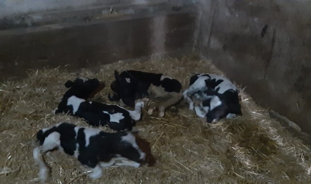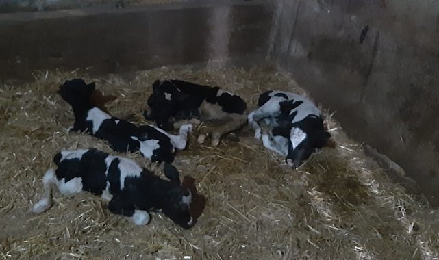 Balıkesir'in Susurluk ilçesine bağlı Ilıcaboğazı kırsal mahallesinde inek, aynı anda 5 buzağı dünyaya getirdi.
