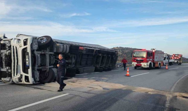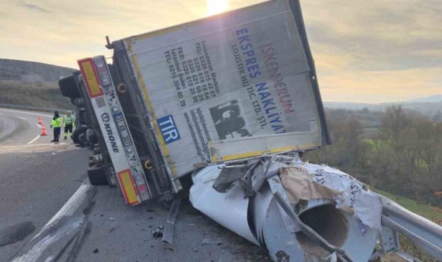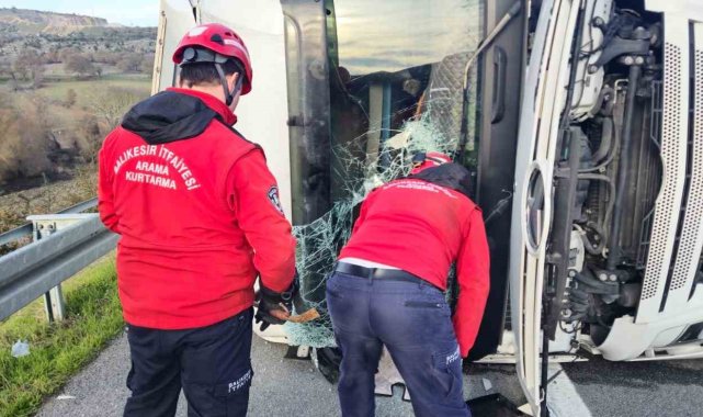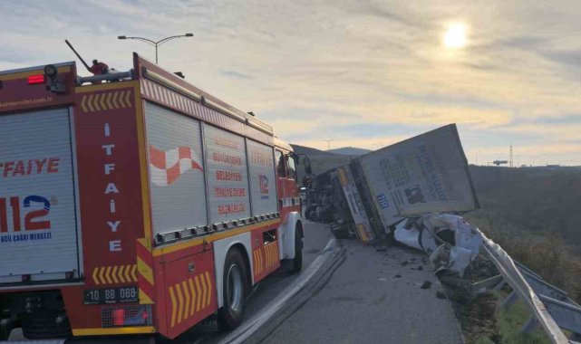 Balıkesir'de Yeniköy gişeler mevkiinde meydana gelen tek taraflı trafik kazasında hız nedeniyle yol kenarında bulunan bariyerlere çarpan tır çekicisi ve dorse yan yattı. Kaza sonrası tır sürücüsü itfaiye ekipleri çekiciden yaralı olarak, çıkarıldı ve 112 ekipleri tarafından hastaneye sevk edildi.Olay; İstanbul-İzmir Otoyolu Yeniköy Kuzey Gişeler Bağlantı Yolunda meydana geldi. Vatandaşların 112 Acil Arama merkezine ihbarı sonucu İtfaiye ve sağlık ekipleri kaza yerine ulaştı. İtfaiye ekipleri olay yerine ulaştığında 31 KK 940 plakalı çekici ve arkasına bağlı 31 KK 307 plakalı dorsenin yol kenarı bariyerlerine çarparak yan yatmış olduğu gördüler. Ekipler araç sürücüsü H.Ş.'nin içerisinde yaralı vaziyette mahsur kaldığı çekiciden uzun uğraşlar sonrası olarak çıkardılar. Tırdan yaralı olarak çıkarılan H.Ş. 112 sağlık ekiplerine teslim edildi. Kaza ile ilgili soruşturma devam ediyor.