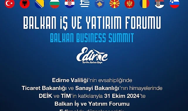 31 Ekim Perşembe günü Edirne'de Balkan Formu düzenlenecek.Erdoğan DEMİR / EDİRNE (İGFA) - Balkan ülkeleri ile iş birliğini güçlendirmeyi ve kalıcı ortaklıklar sağlamayı hedefleyen Balkan Şehirleri İş Birliği Platformu'nun faaliyetleri çerçevesinde, T.C. Edirne Valiliği ev sahipliğinde, T.C. Ticaret Bakanlığı ve T.C. Sanayi ve Teknoloji Bakanlığı himayelerinde, DEİK ve Türkiye İhracatçılar Meclisinin destekleriyle 31 Ekim 2024 tarihinde Balkan İş ve Yatırım Forumu düzenlenecek.Edirne Valisi Yunus Sezer'in ve bakanlarımızın ve ilgili ülke bakanlarının teşrifleriyle gerçekleştirilmesi planlanan söz konusu İş Forum ile , Balkan ticaretinde önemli etkiye sahip katılımcıların bölgedeki iş insanları ile bir araya gelmesi, yeni yatırım fırsatlarının ve iş birliklerinin keşfedilmesi ve ekonomik büyümeye katkı sağlayacak stratejik görüşmelere ev sahipliği yapması amaçlanmaktadır.Detaylı bilgi için; https://www.edirnebalkanforum.com/ adresinden bilgi alınabileceği de açıklandı.