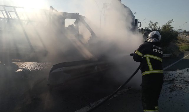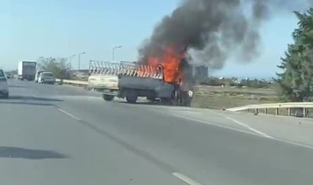 Hatay'ın Arsuz ilçesinde seyir halindeyken alev alan bir transit, kısa sürede kullanılamaz hale geldi. O anlar cep telefonu kamerasına yansıdı.