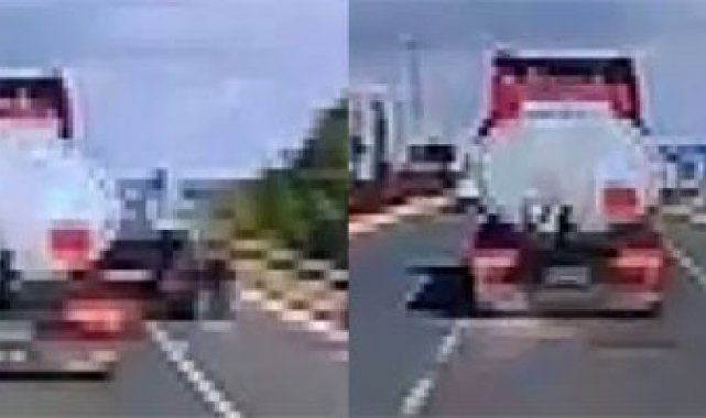 Bariyerlerle tırın arasında sıkışan otomobil metrelerce sürüklendi