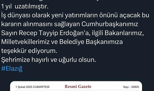 Elazığ Ticaret ve Sanayi Odası Başkanı İdris Alan, 6'ncı bölge teşviklerinin bir yıl uzatıldığını açıkladı.Elazığ'da uygulanan teşvikte 6. bölge avantajlarının devam edip etmeyeceği merak konusu olmuştu. Elazığ Ticaret ve Sanayi Odası Başkanı İdris Alan müjdeyi verdi ve Cumhurbaşkanı Recep Tayyip Erdoğan'ın imzasıyla teşviklerin süresinin 1 yıl uzatıldığını açıkladı. Başkan Alan sosyal medya hesabından konu ile ilgili şu açıklamayı yaptı:''Uzun süreden beri süresinin uzatılması konusunda yaptığımız mücadele sonucu 'Cazibe Merkezi Programı Kapsamında Yatırımların Desteklenmesi hakkındaki karar Resmi Gazetede yayınlanarak ilimizin 6. bölge imkanlarından faydalanması süresi 1 yıl uzatılmıştır. İş dünyası olarak yeni yatırımların önünü açacak bu kararın alınmasını sağlayan Cumhurbaşkanımız Recep Tayyip Erdoğan'a, ilgili Bakanlarımız, milletvekillerimiz ve belediye başkanımıza teşekkür ediyorum. Şehrimize hayırlı ve uğurlu olsun''.