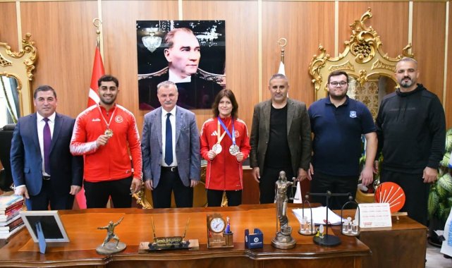 Yunusemre Belediye Başkanı Semih Balaban, Yunusemre Belediyespor'un milli judocuları Sura Nil Karasu ve Enes Pınar'ı makamında ağırlayarak başarılarından dolayı kutladı.