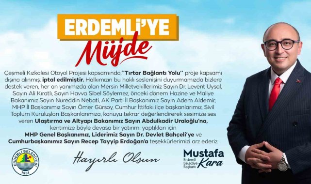 Mersin'in Erdemli Belediye Başkanı Mustafa Kara, Çeşmeli Kızkalesi Otoyol Projesi kapsamında 'Tırtar Bağlantı Yolu'nun proje kapsamı dışına alınarak iptal edildiğini bildirdi.Kentte yapımı süren Çeşmeli-Kızkalesi Otoyol Projesi çerçevesinde vatandaşlar 'Tırtar Bağlantı Yolu'nun iptal edilmesini istedi. Bunun üzerine Erdemli Belediye Başkanı Mustafa Kara, beraberinde MHP Mersin Milletvekili Levent Uysal ile geçtiğimiz aylarda Ulaştırma ve Altyapı Bakanı Abdulkadir Uraloğlu ile görüşerek, vatandaşların talebini ileterek sunum gerçekleştirdi. Sunumun ardından bugün beklenen iptal kararının geldiğini Erdemli Belediye Başkanı Mustafa Kara açıkladı.Başkan Kara yaptığı açıklamada:"Çeşmeli Kızkalesi Otoyol Projesi kapsamında,'Tırtar Bağlantı Yolu' proje kapsamı dışına alınmış, iptal edilmiştir. Halkımızın bu haklı seslenişini duyurmamızda bizlere destek veren, her an yanımızda olan Mersin Milletvekillerimiz Dr. Levent Uysal, Ali Kıratlı, Havva Sibel Söylemez, önceki dönem Hazine ve Maliye Bakanımız Nureddin Nebati, AK Parti İl Başkanımız Adem Aldemir, MHP İl Başkanımız Ömer Gürsoy, Cumhur İttifakı ilçe başkanlarımız, Sivil Toplum Kuruluşları Başkanlarımıza, konuyu tekrar değerlendirerek sesimize ses veren Ulaştırma ve Altyapı Bakanımız Abdulkadir Uraloğlu'na , MHP Genel Başkanımız, liderimiz Devlet Bahçeli'ye ve kentimize böyle devasa bir yatırımı yaptıkları için Cumhurbaşkanımız Recep Tayyip Erdoğan'a teşekkürlerimizi arz ederiz"dedi.
