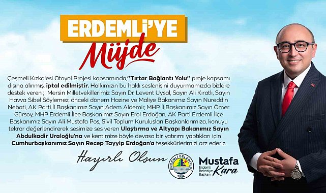 Mersin'in Erdemli Belediye Başkanı Mustafa Kara, Çeşmeli Kızkalesi Otoyol Projesi kapsamında 'Tırtar Bağlantı Yolu'nun proje kapsamı dışına alınarak iptal edildiğini bildirdi.