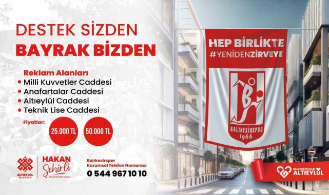 Altıeylül Belediye Başkanı Hakan Şehirli, Balıkesirspor'un "Destek Sizden Bayrak Bizden" kampanyasına Belediye ve personeli adına katıldığını açıkladı."Her zaman yanındayız"Başkan Şehirli, açıklamasında; "Şahsım ve Altıeylül Belediyesi olarak her zaman şehrimizin takımı Balıkesirspor'un yanındayız. Şehrimizde veya il dışlarında maçlara katılıyor, futbolcularımızla kahvaltılarda bir araya geliyor, konuşuyoruz. Onlar bizi, biz onları vakit buldukça ziyaret ediyoruz. Balıkesirspor, şehrimiz için çok önemli. Bizler bu şehrin belediye başkanı olduğumuz için her konuda destek olmamız gerektiğini düşünüyoruz. Belediye olarak her zaman reklam ve tanıtım konusunda elimizden gelen tüm desteği veriyoruz" dedi."Hep birlikte sahip çıkalım"Başkan Şehirli sözlerini şu şekilde sürdürdü: "Bugün burada, personelimiz ve belediye adına biz de 'Destek Sizden Bayrak Bizden' kampanyasına katıldık. Buradan şunu tekrar söylemek istiyorum ki, bu şehir bizim, bu takım bizim. Gelin, hep birlikte bu şehre ve takıma sahip çıkalım" dedi.