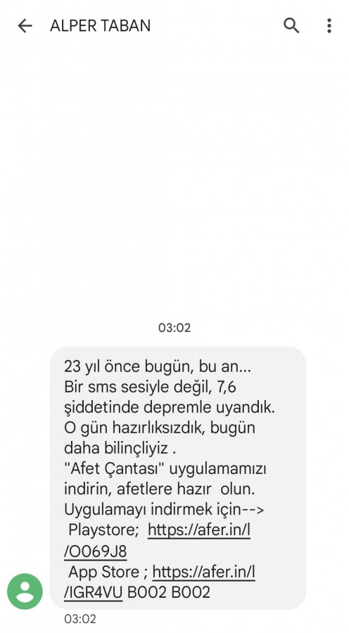 İnegöl Belediye Başkanı Alper Taban, 17 Ağustos 1999 tarihinde meydana gelen ve ülke tarihimizin sonuçları itibariyle en acı depremlerinden biri olarak kayıtlara geçen Gölcük Merkezli depremin 23. Yıl dönümünde, vatandaşları depremin yaşandığı saat olan 03.02'de SMS ile uyardı. Deprem gerçeğini hatırlatan Başkan Taban'ın bu uyarısı ile Marmara Depreminin acısı bir kez daha hatırlandı.23 YIL ÖNCE SMS SESİYLE DEĞİL, DEPREMLE UYANDIKResmi sonuçlara göre 17 Ağustos Depreminde 18.873 insanımız yaşamını yitirmiş, 23.781 insanımız da yaralanmıştı. 328 bin 113 ev ve işyerinin yıkıldığı veya hasar gördüğü depremin üzerinden bugün tam 23 yıl geçti.Depremin 23. Yılında İnegöl halkı, depremin yaşandığı 03.02'de telefonlarına gelen SMS sesi ile uyandı.Başkan Alper Taban'dan gelen SMS'te, "23 yıl önce bugün, bu an... Bir sms sesiyle değil, 7,6 şiddetinde depremle uyandık. O gün hazırlıksızdık, bugün daha bilinçliyiz. "Afet Çantası" uygulamamızı indirin, afetlere hazır olun." İfadeleri yer aldı.