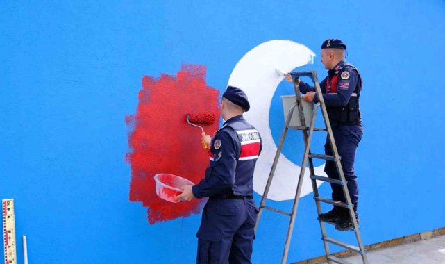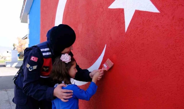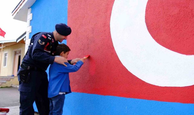 Bayburt jandarmadan öğrencilere anlamlı 'Cumhuriyet' sürprizi: Renksiz duvara dev şanlı Türk bayrağı çizildi