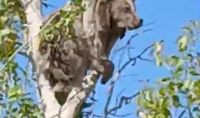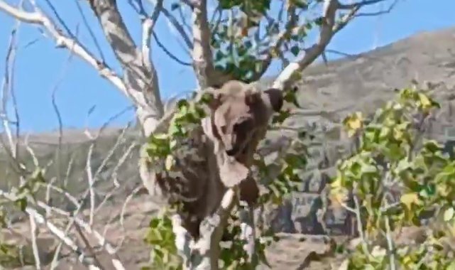 Bayburt'ta bir köyü alarma geçirmişti: Köpeklerden kaçan yavru ayı bu kez ağaç üstünde görüldü