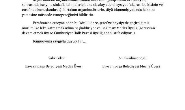 Bayrampaşa Belediye Meclisi Üyeleri Sadi Teker ve Ali Karahasanoğlu, Bayrampaşa Belediye Başkanı Hasan Mutlu'yu suçlayarak CHP'den istifa ettiklerini açıkladı.Sosyal medya hesaplarından CHP'den istifa ettiklerini açıklayan Bayrampaşa Belediye Meclisi Üyeleri Sadi Teker ve Ali Karahasanoğlu, Bayrampaşa Belediye Başkanı Hasan Mutlu'yu suçlayarak "gayri ahlaki tutumlar" sergilediğini ve kamuoyuna yönelik "sinkaflı sözler" kullandığını iddia etti. İki meclis üyesi yollarına bağımsız olarak devam edeceklerini açıkladı. Teker ve Karahasanoğlu; sosyal medyadaki açıklamalarında, "Bayrampaşa halkına samimiyetle hizmet etme yolunda büyük umutlarla çıktığımız yolculuk ne yazık ki Bayrampaşa Belediye Başkanı Hasan Mutlu'nun gayri ahlaki tutumları, para hırsı ve meclis üyeleri ve vatandaşların arkasından sarf ettiği sinkaflı sözlerden dolayı son bulmuştur. Seçim dönemi boyunca sokak sokak, cami cami gezip seçmeni etkileyen, sonrasında ise yine sinkaflı kelimelerle bununla alay eden haysiyet fukarası bu kişinin ve etrafında konuşlandırdığı birtakım organizatörlerin, tüyü bitmemiş yetimin hakkını yemesine müsaade etmeyeceğimizi bildiririz. Etrafımızda cereyan eden bu kötülüklere, şeref ve haysiyetle geçirdiğimiz ömrümüze leke katmamak adına başkaldırıyor ve bağımsız meclis üyeliği görevimiz devam etmek üzere Cumhuriyet Halk Partisi'nden istifa ediyoruz" ifadelerini kullandı.