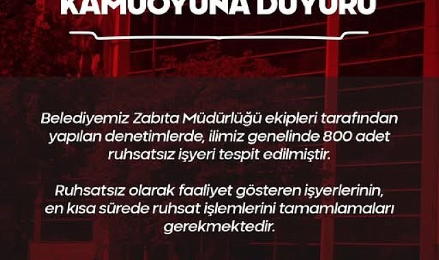 Amasya'da yapılan denetimlerde 800 işyerinin ruhsatsız olduğu tespit edildi.Amasya Belediye Başkanı Turgay Sevindi, "Belediyemiz Zabıta Müdürlüğü ekipleri tarafından yapılan denetimlerde ilimiz genelinde 800 adet ruhsatsız işyeri tespit edilmiştir" dedi.Belediyenin sosyal medya hesabından açıklama yapan Sevindi, "Ruhsatsız olarak faaliyet gösteren işyerlerinin, en kısa sürede ruhsat işlemlerini tamamlamaları gerekmektedir" ifadelerini kullandı.