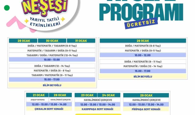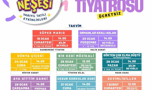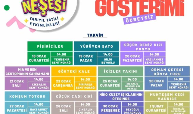 Beyoğlu'nda 15 günlük yarıyıl tatiline özel olarak hazırlanan Karne Neşesi etkinlikleri başlayacak. Öğrenciler, buz pateninden turnuvalara, sinemadan tiyatroya, kültür gezilerinden atölye çalışmalarına kadar onlarca alanda düzenlenecek ücretsiz etkinliklerle gönlünce eğlenme ve öğrenme imkanı bulacak.Beyoğlu Belediyesi öğrencilerin 15 günlük yarıyıl tatilini verimli ve eğlenceli bir şekilde geçirebilmelerini sağlamak amacıyla Karne Neşesi etkinlikleri hazırladı. çocuk tiyatrosundan miyazaki sinema gösterimlerine, kültür gezilerinden atölye çalışmalarına, spor turnuvalarından buz patenine kadar onlarca alanda düzenlenecek ücretsiz etkinliklerle çocuklar gönlünce eğlenme ve öğrenme imkanı bulacak. 18 Ocak Cumartesi gününden itibaren başlayacak olan etkinliklere çocuklar, Beyoğlu Belediyesi'nin resmi web sitesi veya BeyogluApp uygulaması üzerinden ücretsiz olarak kayıt yaptırıp katılabilecekler.Hasköy sahilde buz pateni heyecanıHasköy sahilde çocuklar için özel olarak açılan buz pisti, yarıyıl tatilinin en eğlenceli etkinliklerinden birisi olacak. Pist, 18 Ocak-2 Şubat tarihleri arasında her gün 10.00-20.00 saatleri arasında hizmet verecek. Pist alanında ekipman ve paten eğitimi verilecek olan çocuklar daha sonra buz pistine çıkarak patenle kaymanın keyfini çıkartacaklar.Miyazaki film gösterimleri sinemanın tadını çıkartacaklarÇocuklar sinema gösterimleriyle dolu dolu ve eğlenceli bir tatil dönemi geçirme imkanı bulacaklar. 19 Ocak Pazar günü başlayacak olan sinema gösterimleri Enstitü Beyoğlu'na bağlı Semt Konakları, Bilim Beyoğlu, Beyoğlu Ortaokulu ve İBB Haliç Su Sporları Merkezi'nde gerçekleştirilecek. Miyazaki film gösterimlerinde 'Pişiriciler, Yürüyen Şato, Küçük Deniz Kızı Ponyo, Mia ve Ben Centopıanın Kahramanı, Gökteki Kale, İkizler Takımı, Orman Çetesi Dünya Turu, Komşum Totoro, Küçük Cadı Kiki, Niko Kuzey Işıklarının Ötesinde, Muhteşem Kedi Maurice' yer alacak.Eğlence ve macera dolu çocuk tiyatrosuÇocuklar yarıyıl tiyatro gösterimleriyle unutulmaz bir deneyim yaşayacak. Eğlence ve macera dolu tiyatro oyunları 18 Ocak Cumartesi günü başlayacak ve 1 Şubat Cumartesi gününe kadar farklı mekanlarda ve salonlarda çocuklarla buluşacak. Sahnelenecek tiyatro oyunları 'Süper Mario, Ormanlar Kıralı Aslan, Dünya Çiçeği, Bir Kedi Müzikali, Gökten Çok Elma Düştü, Aya Gittim Sanki, Cesur Korkuluk Kuki, Sevimligiller' olarak belirlendi.Beyoğlu'nun tarihine yolculukÖğrenciler, Kültür Gezisi ile Beyoğlu'nun tarihi ve kültürel mirasını gezerek yerinde öğrenme imkanı bulacaklar. Rehber eğitmenler eşliğinde gerçekleştirilecek gezilerde; 6 Daire (İlk belediye binası), Galata Kulesi, Galata Mevlevihanesi, Rahmi Koç Müzesi, Mehmet Akif Kültür Müzesi, Dijital Deneyim Müzesi ve İstanbul Modern ziyaretleri gerçekleştirilecek.Spor turnuvaları ve atölye çalışmaları düzenlenecekYarıyıl tatili etkinliklerinden birisi de spor turnuvaları olacak. Çocuklar sağlıklı ve zinde kalmanın yanı sıra dostluğun ve birlikteliğin kazanacağı tatlı bir rekabet içerisinde olacaklar. Beyoğlu Spor Tesislerinde gerçekleştirilecek turnuvalar kapsamında ayak tenisi ve penaltı turnuvaları düzenlenecek. Eğitici ve eğlenceli atölye çalışmalarıyla da çocuklar dolu dolu bir yarıyıl tatili geçirecekler. Atölye çalışmaları Bilim Beyoğlu ile Enstitü Beyoğlu'na bağlı Semt Konaklarında gerçekleştirilecek. 'Ahşap Boyama, Hayalimdeki Çerçeve, Biblo Tasarım, Çılgın Şapka, Anahtarlık Yapımı, Doğa, Matematik, Tasarım' yapılacak atölye çalışmaları olarak yer alıyor.