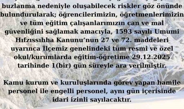 Şırnak'ın Beytüşşebap ilçesinde yoğun kar yağışı nedeniyle eğitime 1 gün ara verildi.Beytüşşebap Kaymakamlığı, kar yağışı sebebiyle eğitime 1 gün ara verildiğini duyurdu. Duyuruda şu ifadelere yer verildi:"Etkili olan kar yağışı nedeniyle buzlanma ve don olayına karşı oluşabilecek risk göz önünde bulundurularak, öğrencilerimizin ve öğretmenlerimizin tüm eğitim çalışanlarımızın can ve mal güvenliğini sağlamak amacıyla 1593 sayılı Umumi Hıfzıssıhha Kanunun 27 ve 72'nci maddeleri uyarınca ilçemiz ve genelindeki tüm resmi ve özel okullarda eğitim ve öğretime 1 gün ara verilmiştir" denildi.