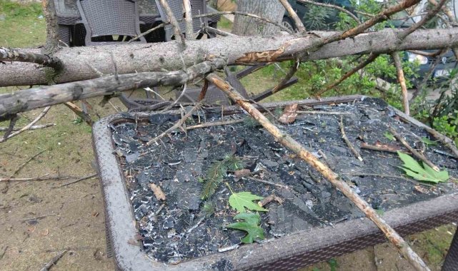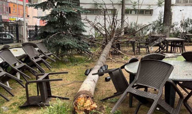 Bilecik'te bir çay bahçesinde bulunan 18 metrelik çam ağacı kökünden kırılarak devrildi.Bugün öğleden sonra Bilecik'te aniden bastıran sağanak yağış ve fırtına kentte çatıları uçururken, ağaçları dallarından kopardı. Yaşanan fırtınada üzerine ağaç dalları düşen araçlar hasar görürken, belediye ekipleri seferber oldu.Bahçede kimsenin olmaması faciayı önlediBilecik merkez Cumhuriyet Mahallesi Cumhuriyet Caddesi üzerinde bulunan bir çay bahçesinde bulunan boyu yaklaşık 18 metrelik bir ağaç kökünden kırılarak bahçeye devrildi. Bahçede bulunan masa ve sandalyelere zarar veren ağaç görenleri hayrete düşürdü. O esnada havanın soğuk olmasından bahçede kimsenin oturmaması muhtemel bir facianın önüne geçti.