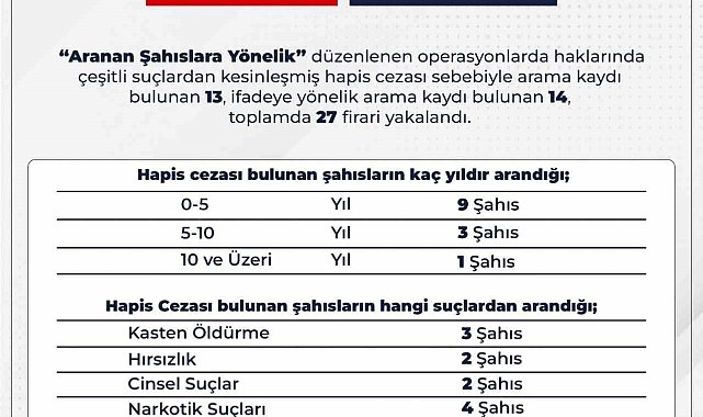 Bingöl'de düzenlenen operasyonlarda haklarında arama kararı bulunan 27 kişi yakalandı.Bingöl Valiliğinden yapılan açıklamada, aranan şahıslara yönelik düzenlenen operasyonlarda haklarında çeşitli suçlardan kesinleşmiş hapis cezası sebebiyle arama kaydı bulunan 13 ve ifadeye yönelik arama kaydı bulunan 14 olmak üzere toplamda 27 firarinin yakalandığı belirtildi.