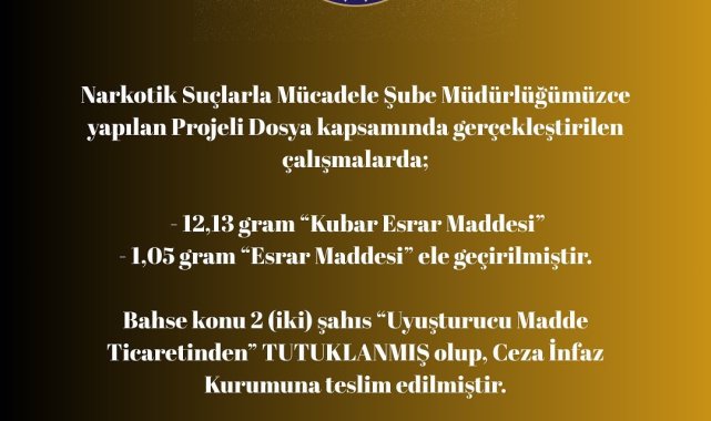 Bingöl'de polis ekipleri tarafından yapılan çalışmada, çeşitli suçlardan aranan 4 şüpheli yakalandı.Bingöl İl Emniyet Müdürlüğü aranan şahsıların yakalanması için çalışmalarını sürdürüyor. Bu çerçevede çeşitli suçlardan aranan 4 şüpheli yakalandı. Öte yandan Narkotik Suçlarla Mücadele Şube Müdürlüğü tarafından yapılan çalışmalarda ise 12.13 gram kubar esrar, 1.05 gram esrar maddesinin ele geçirildiği, konu ile ilgili 2 şüphelinin 'Uyuşturucu Madde Ticareti' suçundan tutuklanarak cezaevine gönderildiği bildirildi.
