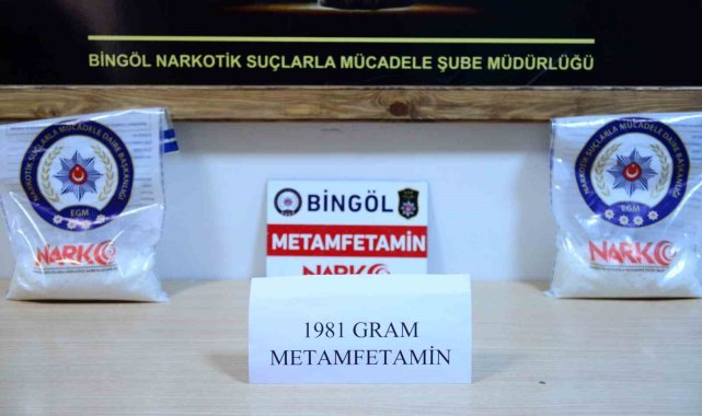Bingöl'de polis ekiplerince düzenlenen operasyonda, kargo poşeti içerisindeki perdelerin arasına gizlenmiş vaziyette 1 kilo 981 gram metamfetamin ele geçirildi.Bingöl İl Emniyet Müdürlüğüne bağlı Narkotik Suçlarla Mücadele Şube Müdürlüğü ekipleri, uyuşturucu madde imal ve ticaretini önlemek amacıyla çalışma gerçekleştirdi. Kentte, Doğu illerinden gelen kargo firmaları aracılığıyla uyuşturucu madde sevkiyatı yapılacağı yönünde istihbarat alınması üzerine kargo firmaları çevresinde tertibat alındı. Bir şüpheli üzerinde yapılan çalışmada, kargo poşetine konulan perdelerin arasına saklanmış vaziyette 1 kilo 981 gram metamfetamin ele geçirildi.Şahıs, emniyetteki işlemlerinin ardından adli makamlara sevk edildi.