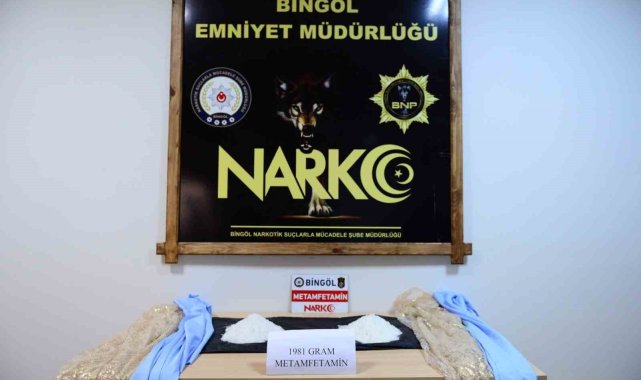 Bingöl'de polis ekiplerince düzenlenen operasyonda, kargo poşeti içerisindeki perdelerin arasına gizlenmiş vaziyette 1 kilo 981 gram metamfetamin ele geçirildi.