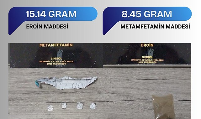 Bingöl'de polis ekipleri tarafından yapılan uyuşturucu operasyonunda çeşitli tür ve miktarlarda uyuşturucu madde ele geçirildi.Bingöl İl Emniyet Müdürlüğü Narkotik Suçlarla Mücadele Şube Müdürlüğü ekipleri, uyuşturucuyla mücadele çalışmalarını sürdürüyor. Bu çerçevede düzenlenen 2 ayrı operasyonda 15,14 gram eroin, 8,45 gram metamfetamin ve 96,75 gram esrar maddesi ele geçirildi. Operasyonda gözaltına alınan ve işlemlerinin ardından adliyeye sevk edilen şüphelinin "Uyuşturucu Madde Ticareti" suçundan tutuklanarak cezaevine gönderildiği bildirildi.