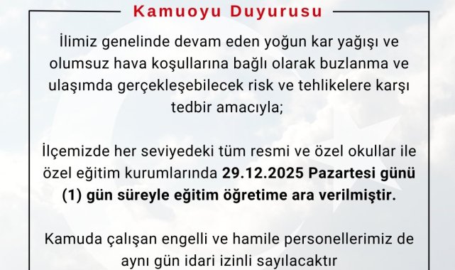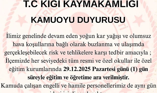 Bingöl genelinde etkisini sürdüren yoğun kar yağışı ve olumsuz hava şartları nedeniyle Kiğı ve Adaklı ilçelerinde eğitime 1 gün ara verildi.Kiğı Kaymakamlığı ve Adaklı Kaymakamlığı tarafından yapılan açıklamada, devam eden yoğun kar yağışı, buzlanma ve ulaşımda yaşanabilecek riskler nedeniyle tedbir amaçlı karar alındığı aktarıldı. Buna göre, 29 Aralık 2025 Pazartesi günü ilçelerdeki her seviyedeki tüm resmi ve özel okullar ile özel eğitim kurumlarında eğitim ve öğretime 1 gün süreyle ara verildiği bildirildi.Açıklamada ayrıca, aynı gün kamu kurum ve kuruluşlarında görev yapan engelli ve hamile personelin idari izinli sayılacağı ifade edildi.