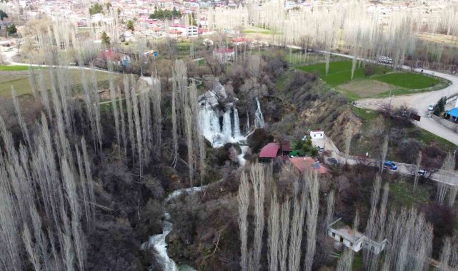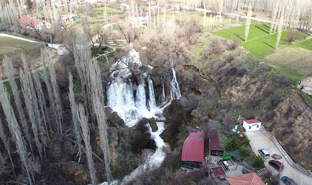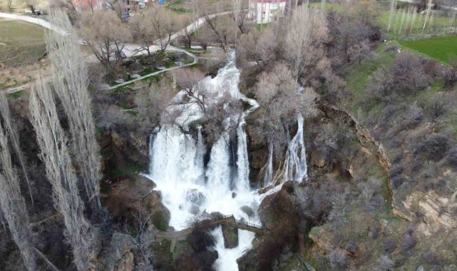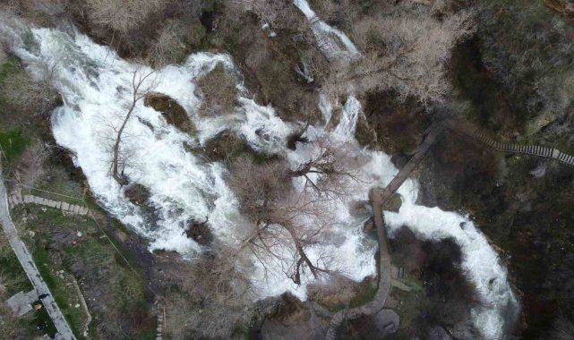 Sivas'ın Gemerek ilçesine bağlı Sızır beldesinde bulunan Sızır Şelalesi, kış aylarında yağan karların erimesi ve bahar yağışlarının etkisiyle son yılların en yüksek debili günlerini yaşıyor. Debisi artan şelale dron kamerasıyla görüntülendi.