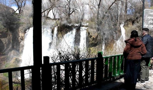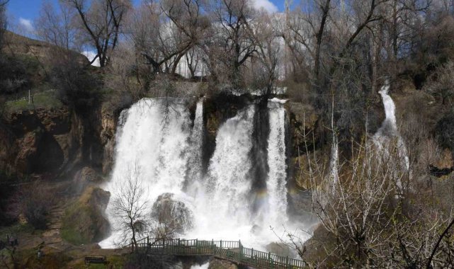 Sivas'ın Gemerek ilçesine bağlı Sızır beldesinde bulunan Sızır Şelalesi, kış aylarında yağan karların erimesi ve bahar yağışlarının etkisiyle son yılların en yüksek debili günlerini yaşıyor. Debisi artan şelale dron kamerasıyla görüntülendi.Sızır Şelalesi'ni besleyen derenin debisi, Sivas genelinde kış mevsiminde yağan karların erimesi ve bahar aylarında etkili olan yağışlarla birlikte yükseldi. Artan su miktarıyla birlikte şelale son yılların en coşkulu günlerini yaşarken ortaya çıkan manzara havadan görüntülendi.Doğal güzelliğiyle her mevsim ziyaretçi çeken şelale, bu günlerde çevre iller ve ilçelerden gelen ziyaretçilerin de uğrak noktası oldu. Sivas'ın yanı sıra Yozgat'tan da gelen vatandaşlar, şelaleyi izleyerek bol bol fotoğraf ve video çekip sosyal medya hesaplarında paylaşıyor.Öte yandan suyun yoğun akışı nedeniyle bölgede güvenlik önlemleri de artırıldı. Jandarma ekipleri, şelalenin alt kısmına inilen yürüyüş yolunun tehlike oluşturabileceği gerekçesiyle bölgeye şerit çekerek ziyaretçilerin aşağıya inmesine izin vermiyor.Ailesiyle birlikte şelaleyi görmeye gelen Eyüp Göksu ise, "Sızır Şelalesinin son dönemdeki yağışlardan dolayı artmasıyla birlikte ailemle birlikte bu doğa güzelliğini izlemeye geldik" dedi.
