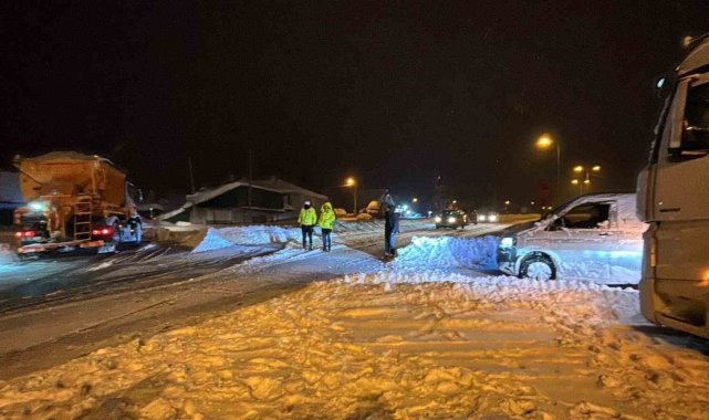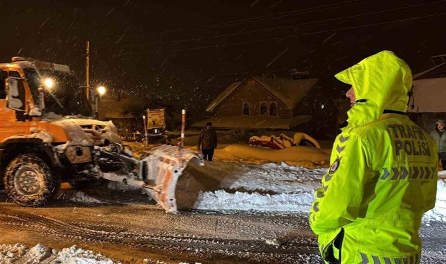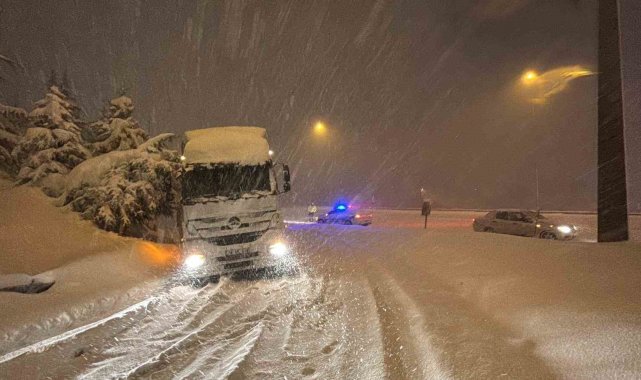 Bolu'da etkisini artıran yoğun kar yağışı nedeniyle Abant Gişeleri bağlantı yolunda bir tır kontrolden çıkarak şarampole kaydı. Kar kalınlığının 40 santimetreyi aştığı Bolu Dağı güzergahı, ağır tonajlı araçların geçişine kapatıldı.Bolu'da akşam saatlerinde şiddetini artıran yoğun kar yağışı ulaşımı olumsuz etkiliyor. TEM Otoyolu'ndan çıkış yapmak isteyen sürücüsünün ismi öğrenilemeyen bir tır, Abant Gişeleri bağlantı yolunda kayganlaşan zemin nedeniyle kontrolden çıkarak şarampole kaydı. Kazada yaralanan olmazken, tırın kurtarılması için çalışma başlatıldı.Kar kalınlığı 40 santimetreyi geçtiBölgede aralıksız devam eden yağışla birlikte Türkiye'nin en önemli geçiş güzergahlarından biri olan Bolu Dağı'nda kar kalınlığı 40 santimetreyi aştı. Karayolları ekipleri güzergahta kar küreme ve tuzlama çalışmalarını aralıksız sürdürürken, polis ekipleri de denetimlerini sıklaştırdı.Ağır tonajlı araçlara Bolu Dağı geçişi kapatıldıYoğun kar yağışı ve buzlanma riski nedeniyle D-100 kara yolu Bolu Dağı geçişi, İstanbul ve Ankara yönlerinde ağır tonajlı araçların trafiğine kapatıldı. Polis ekipleri, tır ve kamyonları Elmalık Kavşağı'ndan TEM Otoyolu'na yönlendiriyor. Bölgede kar yağışının etkisini azaltması ve yolun güvenli hale gelmesinin ardından ağır tonajlı araçların geçişine izin verileceği öğrenildi.