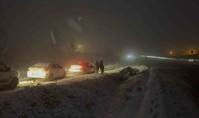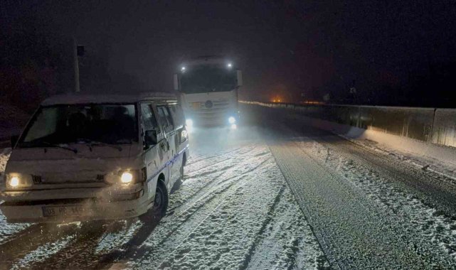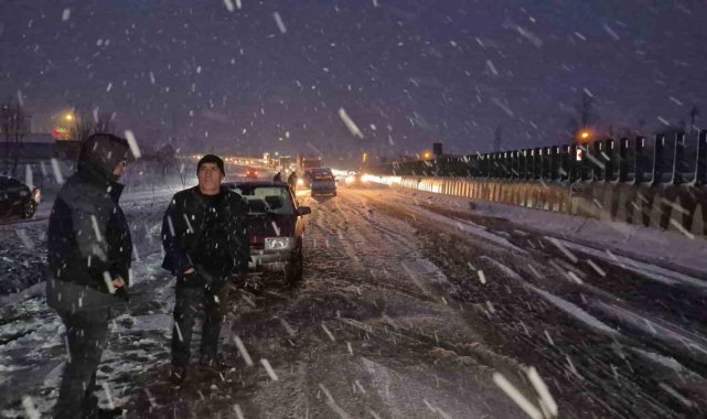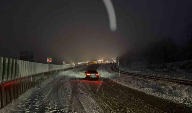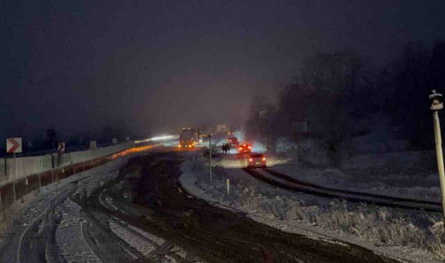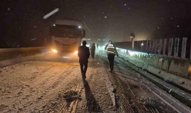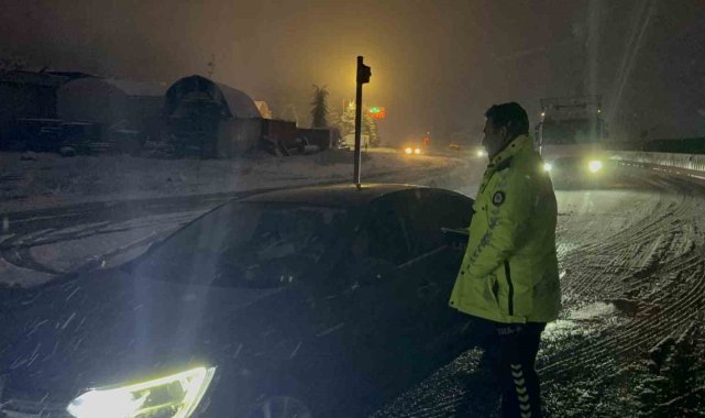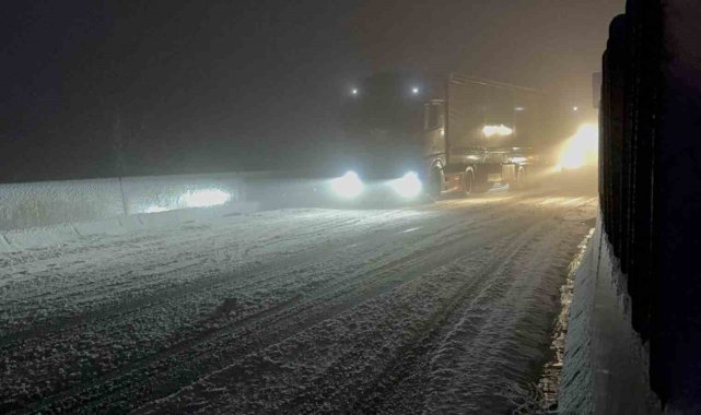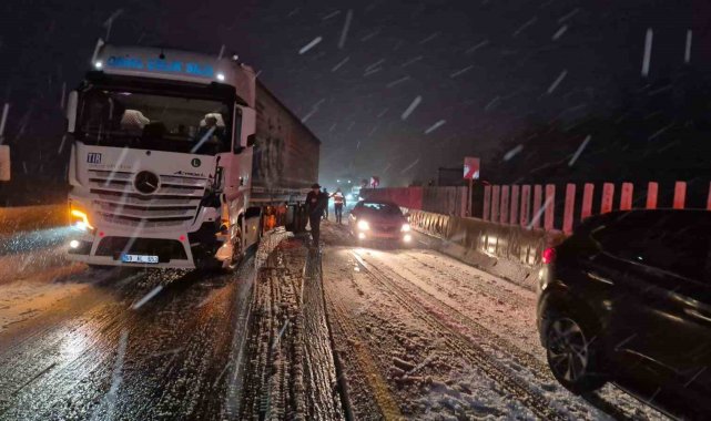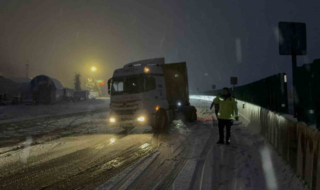 Meteoroloji'den yapılan uyarının ardından Bolu Dağı'nda kar yağışı aniden bastırınca tırlar yolda kaldı. Kalan araçlar da polis ekiplerince geri döndürülürken, yolun her iki şeride de büyük araç geçişine kapatıldı.Türkiye'nin en önemli geçiş güzergahlarından olan Bolu Dağı'nda kar yağışı etkili oldu. Yollar bir anda beyaza bürünürken her iki istikamette de bazı tırlar yolda kaldı. Kar kalınlığının 5 santimetreye ulaştığı bölgede tırlar yolda kalınca, küçük araçlarda polis ekiplerince geri döndürüldü. Bölge trafik ekiplerinin çalışmalarıyla küçük araçların tamamı yoldan gönderilirken, büyük araçların geçişi ise her iki istikamette de durduruldu.Karayolları ekipleri de bölgede küreme ve tuzlama çalışmalarına başlarken, hem İstanbul istikametine hem de Ankara istikametine Bolu Dağı'nda kar yağışı devam ediyor. Öte yandan yolda kalan sürücüler, "Karayolları yolu sıyırırsa burada araç kalmaz. 10-15 dakika oldu. Kar aniden bastırdı" ifadelerini kullandı.