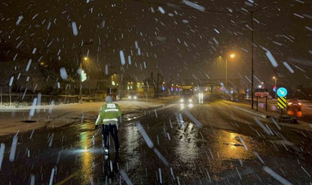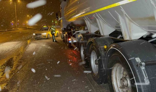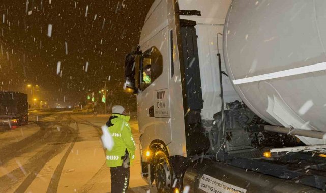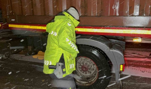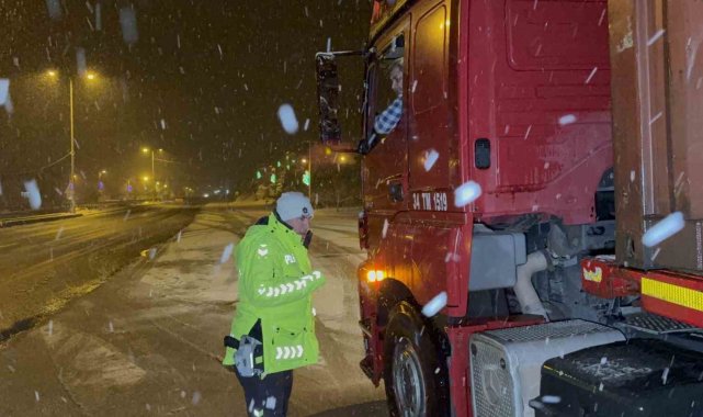 Düzce'de etkili olan kar yağışı sebebi ile Bolu Dağı'nda olumsuzluk yaşanmaması adına bölge trafik ekipleri tır ve kamyonları kontrol ederek ilerlemelerini sağlıyor.