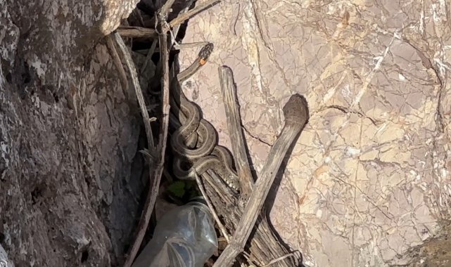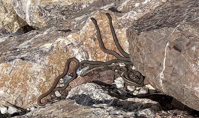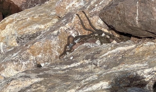 Hakkari'nin Yüksekova ilçe merkezine 20 kilometre uzaklıkta bulunan 'Yılan Pınarı' bölgesinde sürü halinde güneşlenen yılanlar, Brezilya'nın 'Yılan Adası'nı andırıyor.