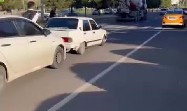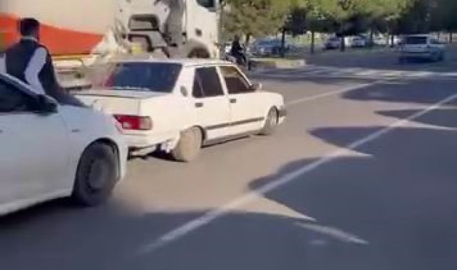 Diyarbakır'da bir kişi, yolda kalan Fiat Tofaş marka aracı, başka bir aracın kaputunun üzerine oturup ayakları ile ittirdi. Trafiğin tehlikeye atıldığı o anlar cep telefonu kamerasına yansıdı.