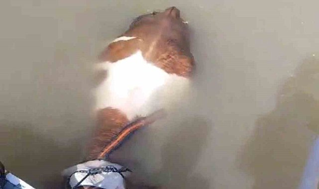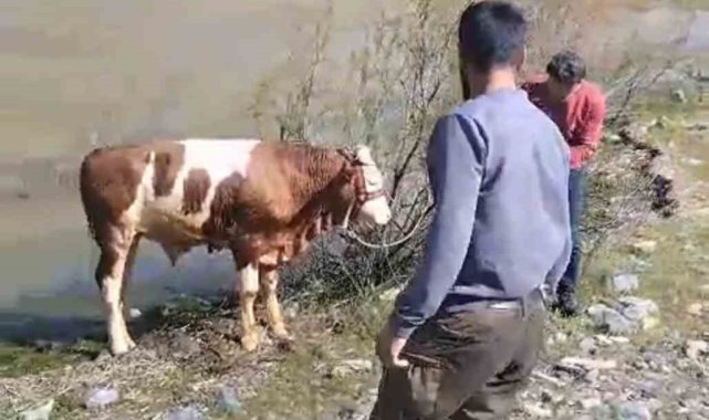 Elazığ'ın Palu ilçesinde Murat Nehri'ne giren ve bir adada mahsur kalan tosun, balıkçı Memet Şekerci ve arkadaşları tarafından kelek yardımıyla kurtarıldı.