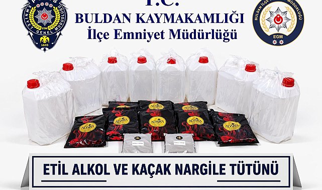 Denizli'nin Buldan ilçesinde düzenlenen operasyonda 40 litre etil alkol ile 9 kilo kaçak nargile tütünü ele geçirildi.