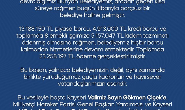 31 Mart 2024 yerel seçimleri sonrası 18 milyon 101 bin 150 TL borçla devralınan Bünyan Belediyesi, Başkan Selahattin Metin liderliğinde yürütülen çalışmalar neticesinde kısa sürede borçsuz hale geldi.Göreve geldikten sonra belediyenin 13 milyon 188 bin 150 TL'si piyasa borcu, 4 milyon 913 bin TL'si ise kredi borcu olmak üzere toplam 18 milyon 101 bin 150 TL tutarındaki borcu kapatıldı. Ayrıca, belediyeden emekli olan 8 işçiye toplam 5 milyon 157 bin 47 TL kıdem tazminatı ödemesi gerçekleştirildi. Böylece belediye tarafından toplamda 23 milyon 258 bin 197 TL ödeme yapıldı.Konuyla ilgili açıklama yapan Bünyan Belediye Başkanı Selahattin Metin, bu başarının sadece belediyeye değil, aynı zamanda birlikte yürütülen güçlü kadroya ve desteklerini esirgemeyen hayırsever vatandaşlara ait olduğunu vurguladı. Başkan Metin, desteklerinden dolayı başta Kayseri Valisi Sayın Gökmen Çiçek'e, MHP Genel Başkan Yardımcısı ve Kayseri Milletvekili Sayın İsmail Özdemir'e, Cumhur İttifakı'nın kıymetli milletvekillerine ve destek veren tüm vatandaşlara teşekkür etti.Başkan Metin, açıklamasında şu ifadelere yer verdi:"Söz verdiğimiz gibi Bünyan'da israfı sona erdirdik, şeffaflığı esas aldık ve kaynaklarımızı halkımız için kullandık. Artık hedefimiz; borçsuz, güçlü ve hizmet odaklı bir belediyecilik anlayışıyla Bünyan'ımızı daha da ileri taşımaktır."