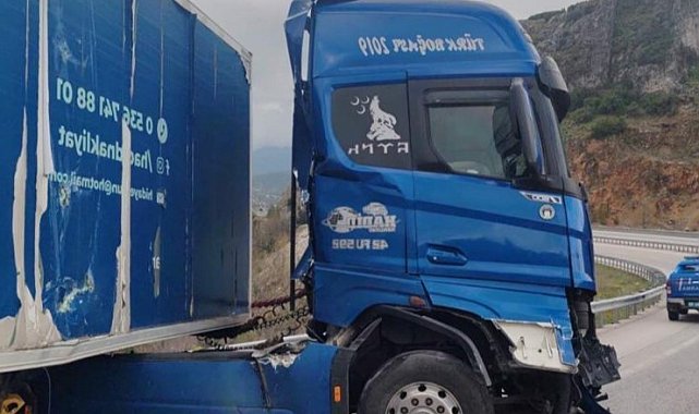 Burdur'da sürücüsünün direksiyon hakimiyetini kaybetmesi sonucu tırın demir bariyerlere çarptığı kazada tır sürücüsü yaralandı.