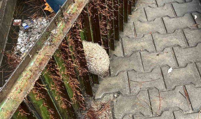 Balıkesir'in Burhaniye ilçesinde bir yağmur gideri mazgalına sıkışan kirpi, itfaiye ekiplerinin titiz çalışması sonucu kurtarıldı.