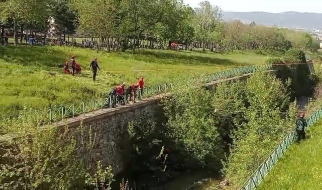 Bursa'da gerçekleştirilen tatbikatta ekipler, senaryo gereği dere yatağındaki yaralıları halatlarla kurtardı.